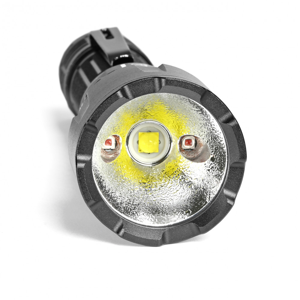 - Потужне двохкольорове освітлення: основний світлодіод CREE XHP50.2 забезпечує яскраве біле світло (до 3600 Lm), а два червоні світлодіоди CREE XPE ідеальні для нічного режиму, щоб не втратити нічний зір, або для подачі сигналів.